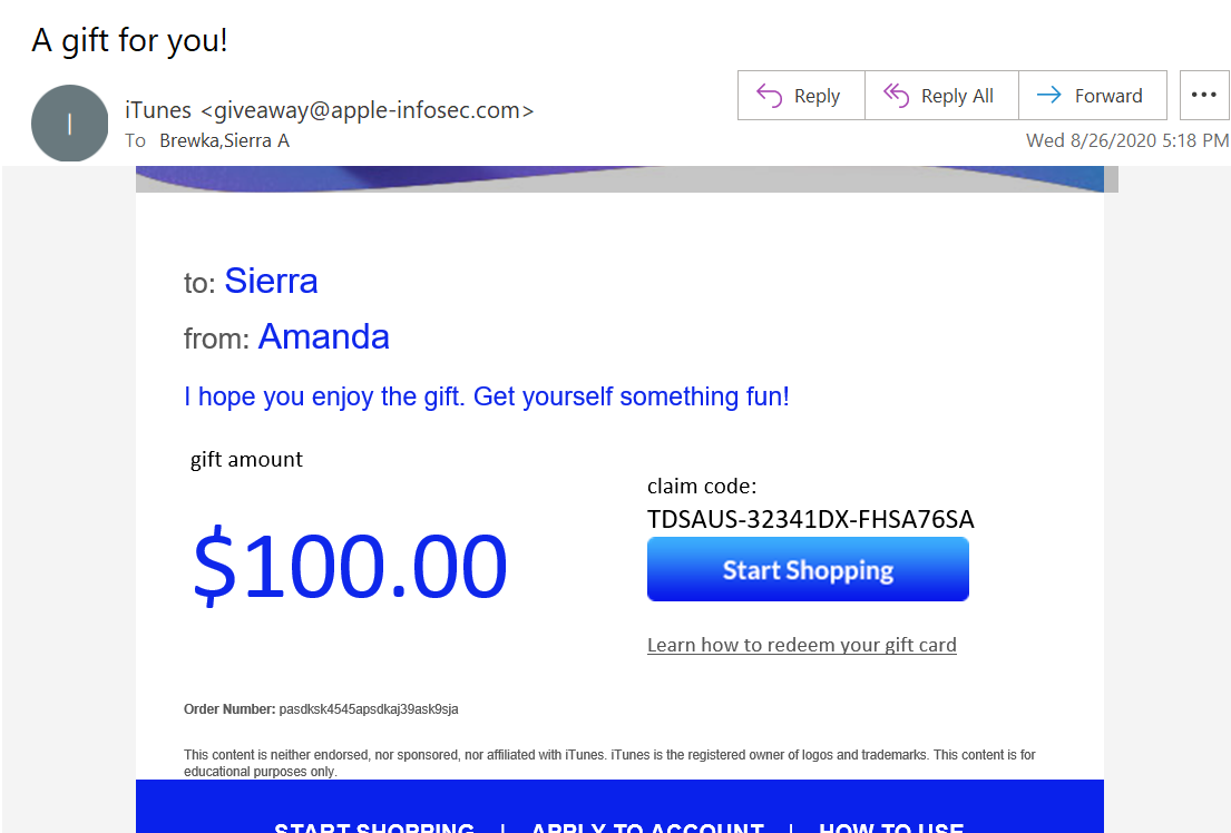 Itunes Gift Card Email Scams : But they're popular with scammers because they're.. They can repeat the scam against hundreds or even thousands of victims, which can soon instead of solely focusing on finance or hr employees like other forms of bec attacks, scammers impersonate a wide variety of identities on the. Email scams are increasingly involving itunes gift cards, instead of the old wire transfers. Apple is accused of lying when it says that there is no way to trace or refund the value of the cards … Gift cards are popular with con artists and fraudsters. While not new, gift card scams are on the rise and can result in a victim losing hundreds or thousands of dollars.